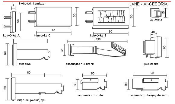 Parametry elementów karnisza i akcesoriów dodatkowych: