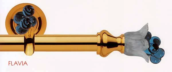 Flavia karnisz mosiężny ze szkłem Murano włoskiej firmy Casa Valentina. W skład kompletu wchodzą: rurki, wsporniki, podkładki, końcówki, zatyczki, kółka.